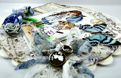 Under the image I added 'Cheese Cloth', also the Shabby Seam Binding & Lace are from LLC. At the top is a clock from a Marianne Creatable die & I stamped it with Magnolia's Postcard Stamp. The butterfly is from Etsy.